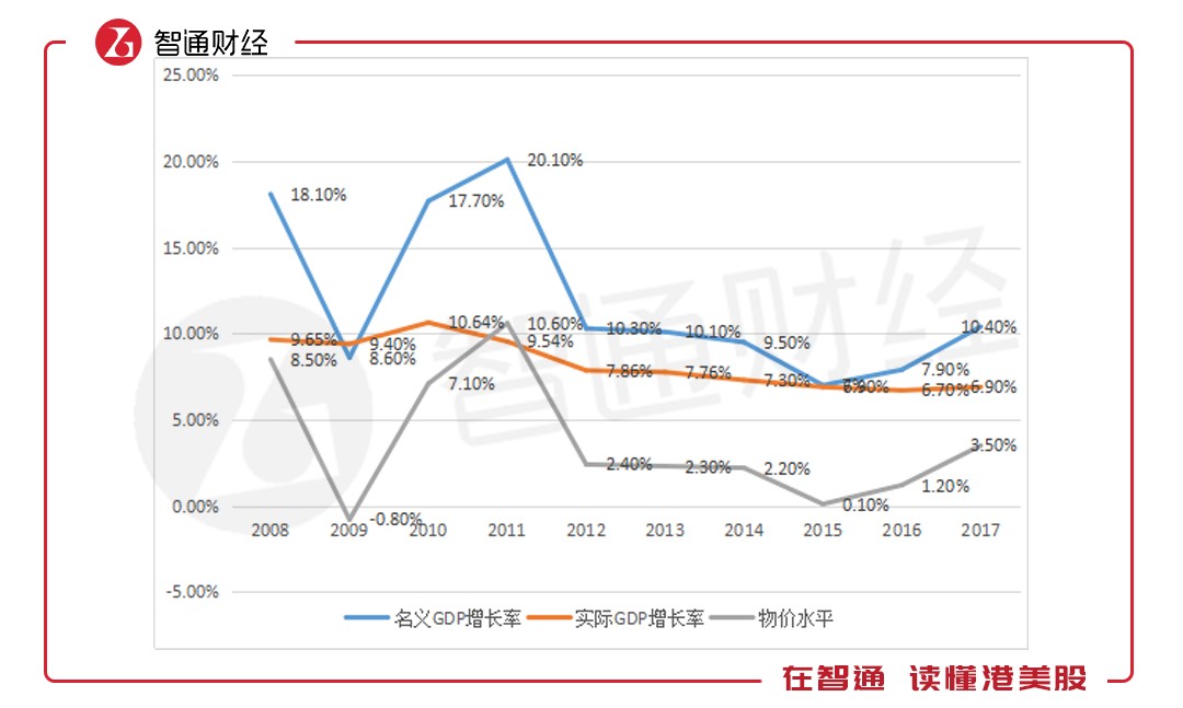 但考慮到物價水平的變化,此時農(nóng)村的消費水平并不能代表購買力水平,智通財經(jīng)APP以實際GDP增長水平和名義GDP增長水平測算每一年的物價水平(物價水平=名義GDP增長水平-實際GDP增長水平),以下為測算圖表: