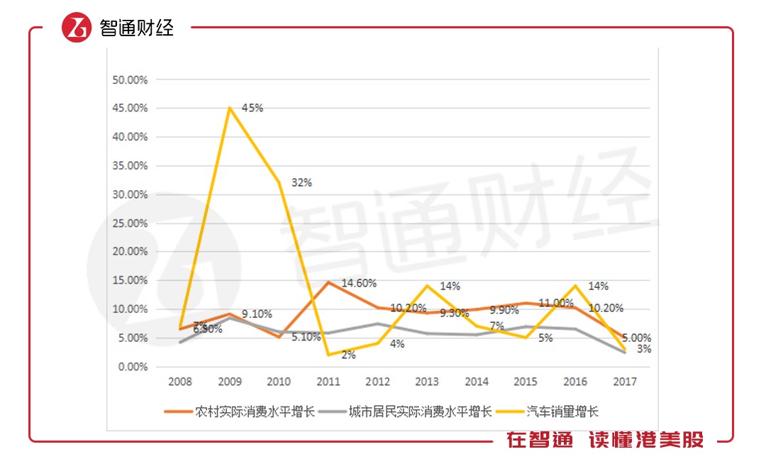 從圖表上看,消費水平的變化跟汽車銷量增長關(guān)系度并不是很強,特別是農(nóng)村地區(qū),比如2011年農(nóng)村消費水平增長達(dá)14.6%,同比增加9.5個百分點,而汽車銷量卻僅增長2%,同比下滑了30個百分點。但2017年這三者達(dá)成了共識,增長水平均下滑,2018年預(yù)計仍同向變動。