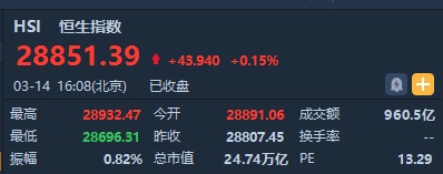 截至收盤,恒生指數(shù)漲43.94點(diǎn)或0.15%,報(bào)28851.39點(diǎn),全日成交額達(dá)960.51億。國企指數(shù)漲41.45%,報(bào)11447.27點(diǎn),紅籌指數(shù)漲0.56%,報(bào)4513.25點(diǎn)。