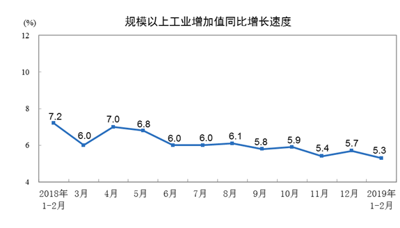 智通財經(jīng)APP獲悉,國家統(tǒng)計局今日公布,2019年1-2月份,規(guī)模以上工業(yè)增加值同比實際增長5.3%(以下增加值增速均為扣除價格因素的實際增長率),預期增長5.6%,前值為6.2%。據(jù)測算,剔除春節(jié)因素影響增長6.1%。從環(huán)比看,2月份,規(guī)模以上工業(yè)增加值比上月增長0.43%。