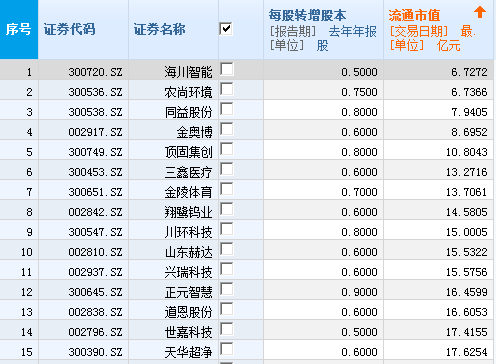 據(jù)統(tǒng)計(jì),今年高送轉(zhuǎn)(10送5以上)個(gè)股共41只,其中流通市值20億一下的共計(jì)15只,列舉出來(lái),供投資者參考。