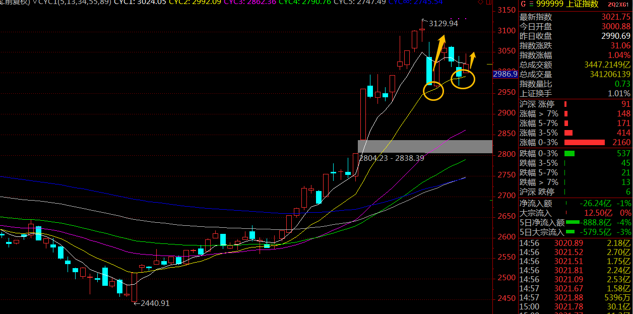 如果能在2938點(diǎn)企穩(wěn),則后續(xù)行情相對(duì)樂(lè)觀,也可以在較短時(shí)間內(nèi)完成調(diào)整。同時(shí),結(jié)合日k圖的成本均線指標(biāo)看,兩次回踩十天成本均線,反彈力度呈現(xiàn)出減弱的趨勢(shì),這地方走出第一種走勢(shì)的概率大大增加(跌破2938點(diǎn))。