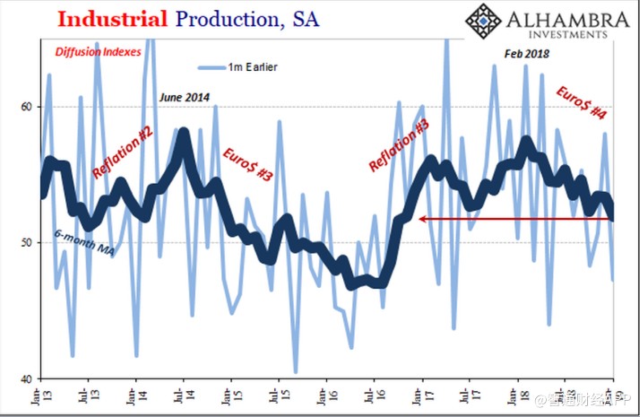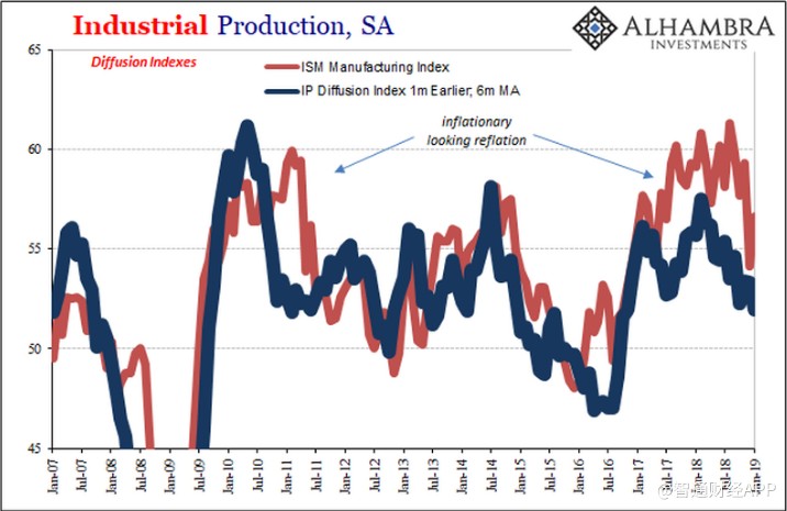 美聯(lián)儲計算了一個擴散指數(shù)(滯后一個月,即更新后的擴散指數(shù)為2019年1月)作為其工業(yè)生產(chǎn)數(shù)據(jù)的一部分。月度數(shù)據(jù)表現(xiàn)不穩(wěn)定,但平均而言在時間和解讀上是明確無誤的。即使是ISM制造業(yè)的PMI的走勢也幾乎跟隨美聯(lián)儲擴散指數(shù)。