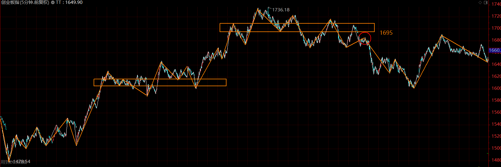 創(chuàng)業(yè)板依舊被上方五分鐘中樞下軌1695點(diǎn)壓制,回踩段連線段都沒(méi)有構(gòu)成,比較弱勢(shì)。本周初的反抽如果不能站上1695點(diǎn),大概率還要繼續(xù)回落,完成結(jié)構(gòu)。