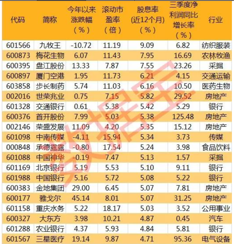 3、高股息率股票貴在穩(wěn)健、安全,長期看,即使市場(chǎng)出現(xiàn)長期調(diào)整,高股息個(gè)股也可以給投資者帶來穩(wěn)定的現(xiàn)金收入;目前高股息率個(gè)股的整體估值較低,根據(jù)以下條件篩選高股息率潛力股:1、滾動(dòng)市盈率小于20倍;2、2016、2017、2018連續(xù)三年股息率大于4%;3、最近12個(gè)月股息率大于4%;4、前三季度凈利潤同比增長。