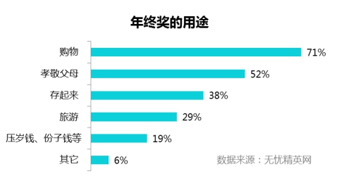 在年終獎的使用上,71%的人會用于購物,52%的人會用于孝敬父母,38%的人會將年終獎存一部分起來,29%的會用于旅行。超過一半的人,以上年終獎的使用類別超過了3項(xiàng),人生的那點(diǎn)小夢想,全仰仗年終獎?!捌綍r每個月還完房貸,收入只夠生活,提升生活質(zhì)量,全靠年終獎,去年的年終獎,我給自己買了臺蘋果筆記本電腦;今年的年終獎,準(zhǔn)備用來去普吉島旅行,沒有年終獎肯定要哭死?!?剛在上海買了房的小杰告訴我們。
