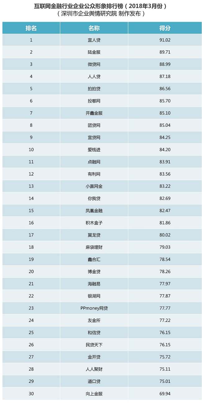 互聯(lián)網(wǎng)金融行業(yè)企業(yè)公眾形象排行榜:本榜單根據(jù)公開可查的信息、數(shù)據(jù),從規(guī)模實(shí)力、合規(guī)性、交易金額、信披透明度、輿論曝光度和負(fù)面影響等六個(gè)維度,對(duì)2018年3月1日至3月31日這一時(shí)段內(nèi)互聯(lián)網(wǎng)金融行業(yè)各企業(yè)的公眾形象進(jìn)行綜合評(píng)估并排名,旨在對(duì)互聯(lián)網(wǎng)金融行業(yè)各企業(yè)開展品牌形象塑造、宣傳推廣策略、公共關(guān)系維護(hù)、品牌影響力等方面的綜合評(píng)價(jià),既幫助相關(guān)企業(yè)找準(zhǔn)合適的品牌定位、發(fā)展方向,也為消費(fèi)者和投資者提供科學(xué)、公正、獨(dú)立的消費(fèi)和投資決策參考。