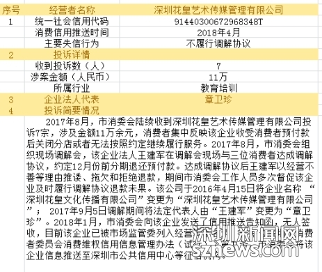 2017年8月,市消委會陸續(xù)收到深圳花皇藝術傳媒管理有限公司投訴7宗,涉及金額11萬余元,消費者集中反映該企業(yè)收受消費者預付款后關閉分店或者無法按照約定繼續(xù)履行服務。2017年8月,市消委會組織現場調解會,該企業(yè)法人王建軍在調解會現場與三位消費者達成調解協(xié)議,約定12月份前分期退還預付款。達成調解協(xié)議后王建軍以經營不善等理由推諉、拖欠和拒絕退款,期間市消委會工作人員多次督促該企業(yè)及時履行調解協(xié)議退款未果。該公司于2016年4月15日將企業(yè)名稱 “深圳花皇文化傳播有限公司”變更為“深圳花皇藝術傳媒管理有限公司”; 2017年9月5日調解期間將法定代表人由“王建軍”變更為“章衛(wèi)珍”。2018年1月,市消委會向該企業(yè)發(fā)送了信用推送告知函,無人簽收,目前該企業(yè)已被市場監(jiān)管委列入經營異常名錄。依據《深圳市消費者委員會消費維權信用信息管理辦法(試行)》第九條,市消委會將該企業(yè)信息推送至深圳市公共信用中心等征信機構。該企業(yè)雖然變更了公司名稱和法定代表人等公司信息,但仍需承擔原企業(yè)未履行的法定或約定義務。