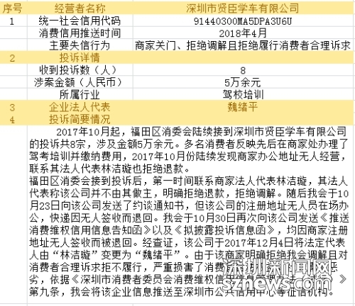 2017年10月起,福田區(qū)消委會陸續(xù)接到深圳市賢臣學車有限公司的投訴共8宗,涉及金額5萬余元。多名消費者反映先后在商家處辦理了駕考培訓并繳納費用,2017年10月份陸續(xù)發(fā)現商家辦公地址無人經營,聯系其法人代表林潔璇也拒絕退款。