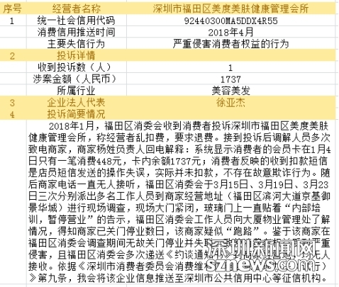 2018年1月,福田區(qū)消委會收到消費者投訴深圳市福田區(qū)美度美膚健康管理會所,稱經營者亂扣費,要求退回余額(會員卡余額1737元)。接到投訴后調解人員多次致電商家,商家楊姓負責人回電解釋:系統(tǒng)顯示消費者的會員卡在1月4日只有一筆消費448元,卡內余額1737元;消費者反映的收到扣款短信是店員短信發(fā)送的操作失誤,實際并未扣款,不存在故意欺詐行為。隨后商家電話一直無人接聽,福田區(qū)消委會于3月15日、3月19日、3月23日三次分別派出多名工作人員到商家經營地址(福田區(qū)濱河大道京基御景華城)進行現場調查,現場大門緊閉,玻璃門上一直貼著“內部培訓,暫停營業(yè)”的告示,福田區(qū)消委會工作人員向大廈物業(yè)管理處了解情況,得知商家已關門停業(yè)數日,該商家疑似“跑路”。鑒于該商家在福田區(qū)消委會調查期間無故關門停業(yè)并失聯,致使消費者權益受到嚴重侵害,且福田區(qū)消委會多次遞送《約談通知書》到商家經營地,均無人接收。依據《深圳市消費者委員會消費維權信用信息管理辦法(試行)》第九條,我會將該企業(yè)信息推送至深圳市公共信用中心等征信機構。