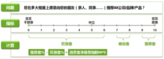 請用戶回答“您在多大程度上愿意向您的朋友(親人、同事……)推薦XX公司/產(chǎn)品?”根據(jù)用戶的推薦意愿,將用戶分為三類:推薦者(得分在9-10之間)、被動(dòng)者(得分在7-8之間)、貶損者(得分在0-6之間)。