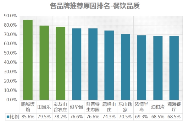 排名第一的是鵬城飯館,餐飲品質(zhì)推薦率為85.6%;其次是田園樂,推薦率為79.5%;第三名是友友山谷農(nóng)莊,推薦率為78.2% 。