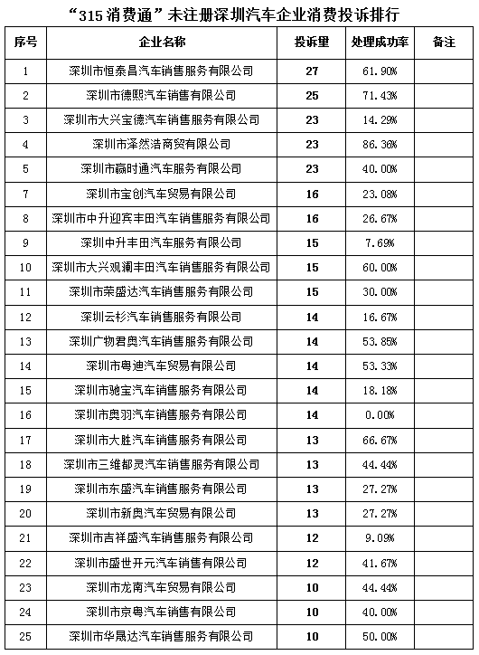 二、“315消費通”未注冊深圳汽車企業(yè)消費投訴排行