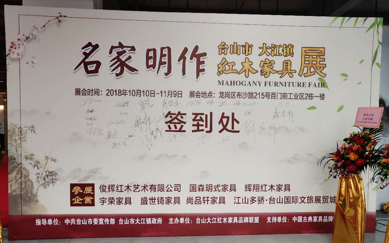 據(jù)了解,此次活動(dòng)參展企業(yè)有:俊輝紅木藝術(shù)有限公司,國森明式家具,輝翔紅木家具,宇榮家具,盛世锜家具,尚品軒家具,江山多驕·臺(tái)山國際文旅展貿(mào)城,活動(dòng)時(shí)間:2018年10月10日-11月09日。