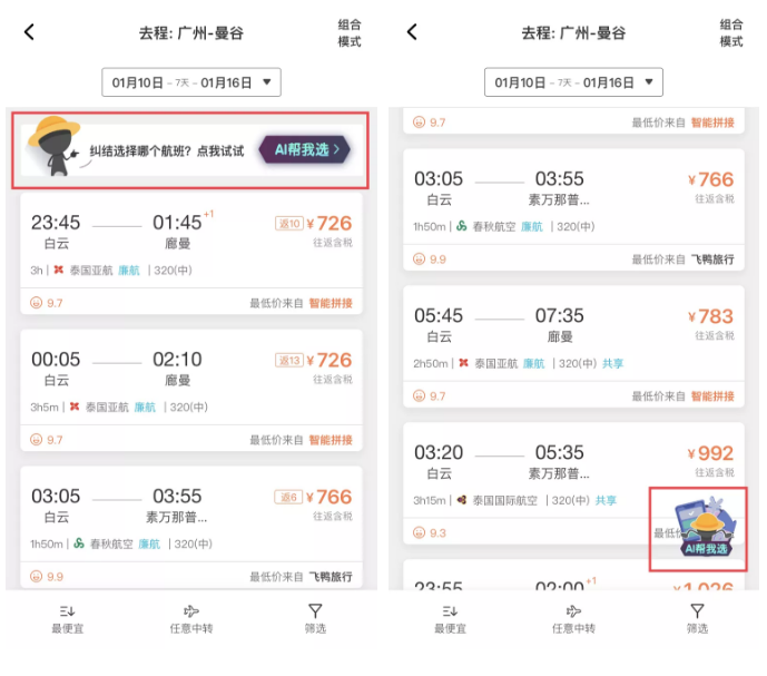 iGola通過AI技術(shù)將傳統(tǒng)的機票搜索頁面中,數(shù)十條的結(jié)果優(yōu)選為5條,通過測試,5條搜索結(jié)果可以基本cover用戶95%的選擇可能。將價格時長航司中轉(zhuǎn)起降時間,設(shè)置為5個維度,以五星維度圖的形式對相關(guān)航旅方案進行直觀的評價,并給出明顯的文字提示,闡明航旅方案亮點。定制內(nèi)容-千人千面,不同需求的乘客(重視價格、重視服務),會得到不同的搜索結(jié)果。UI設(shè)計與傳統(tǒng)的OTA搜索界面有巨大差異,操作極簡,深受年輕用戶喜歡。
