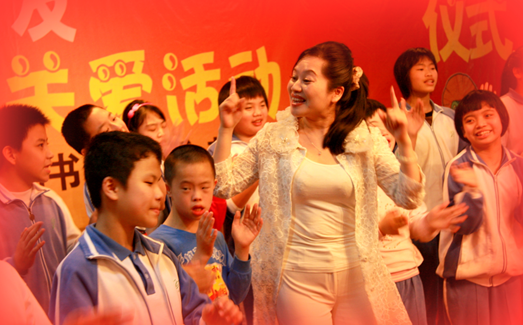 十年堅(jiān)持義務(wù)為盲童教唱的愛(ài)心藝術(shù)家鄭海燕與盲童在一起