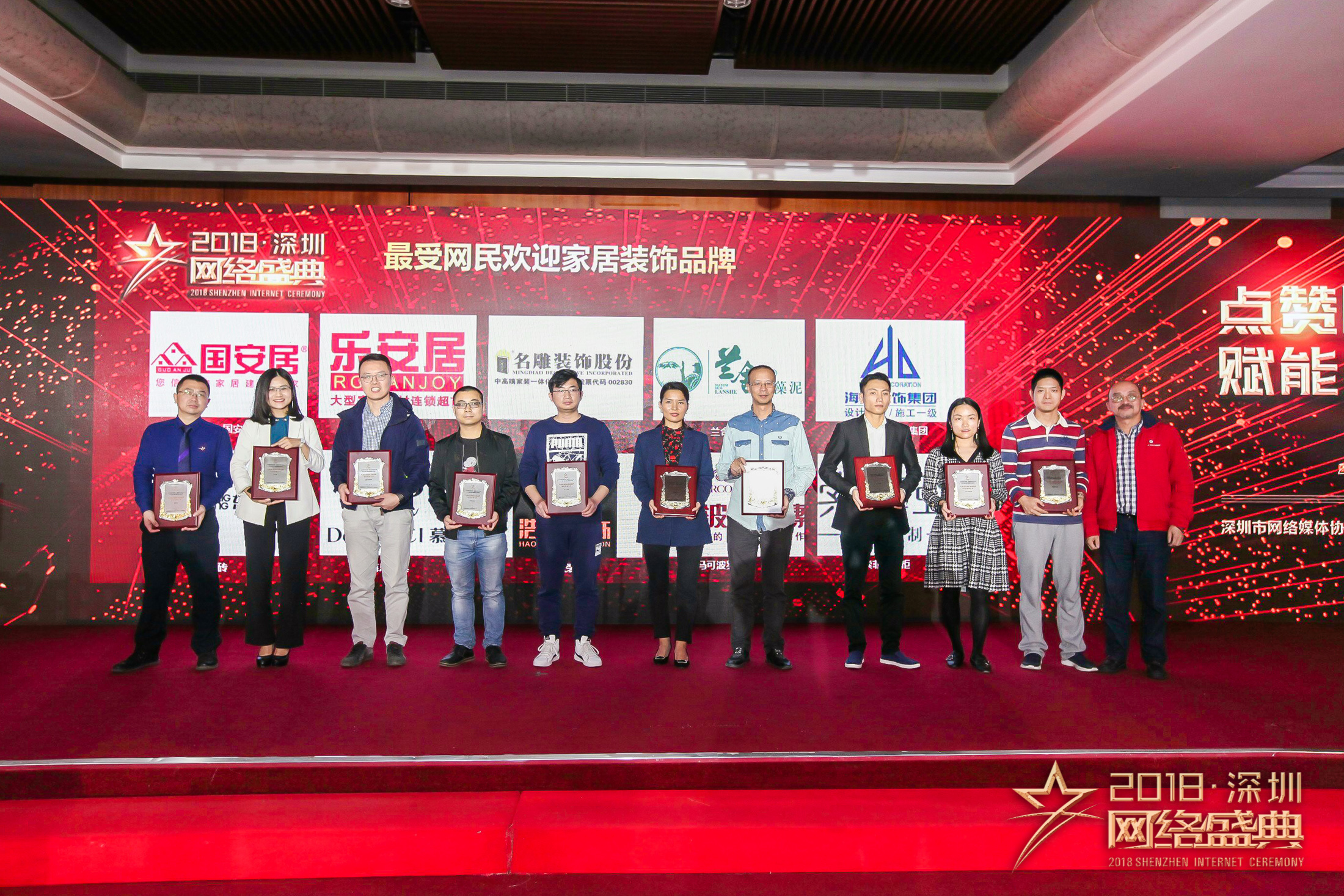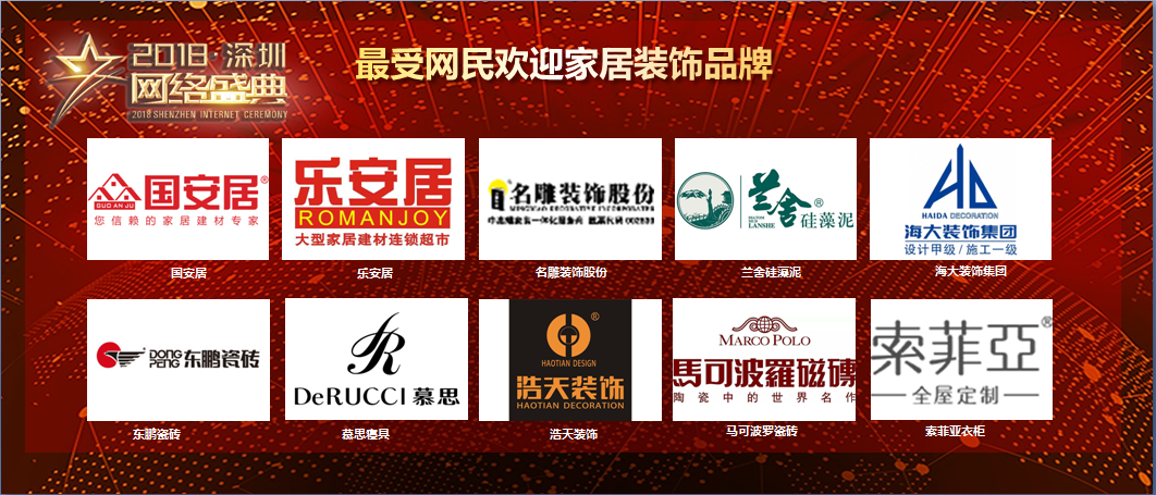 盛典現(xiàn)場“2018年度十大行業(yè)最受網(wǎng)民歡迎品牌”獲獎名錄正式對外公布。國安居;樂安居;名雕裝飾股份;蘭舍硅藻泥;海大裝飾;東鵬瓷磚;慕思寢具;浩天裝飾;馬可波羅瓷磚;索菲亞衣柜10個品牌獲得“2018年度家居裝飾行業(yè)最受網(wǎng)民歡迎品牌”榮譽稱號。