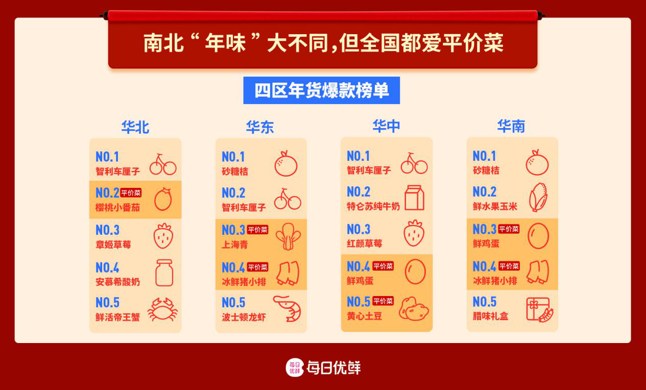 追求年輕化、精品化的華南消費者在年貨消費上也有精打細算的一面。在每日優(yōu)鮮的四區(qū)年貨爆款榜單里,平價親民的鮮水果玉米、鮮雞蛋就被不少華南用戶“加車”,而這些食材的定價,也和春節(jié)期間菜價波動形成了反差。