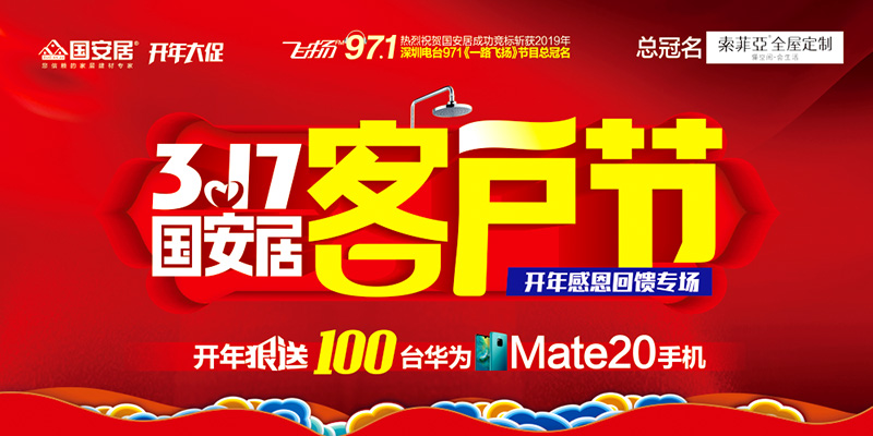 國安居一直心懷感恩,感謝十多年來累計(jì)30萬老客戶的信賴與支持,此次活動(dòng)不僅是為了品牌優(yōu)惠,更多的是給老客戶送去關(guān)懷和福利。國安居特聯(lián)合深圳電臺(tái)971王牌節(jié)目一路飛揚(yáng)鼎力巨獻(xiàn),聯(lián)手旗下百位工廠總裁打造開年大促,推出多重優(yōu)惠:1、開年狠送100臺(tái)華為mate20手機(jī);2、聯(lián)購滿額返100萬現(xiàn)金,上不封頂?shù)瘸祷仞伝顒?dòng),以3.15為契機(jī)來回饋多年來關(guān)注國安居、支持國安居的廣大消費(fèi)者,以最大限度的優(yōu)惠、最為超值的實(shí)惠、最為驚喜的鉅惠獻(xiàn)禮3.17大促!