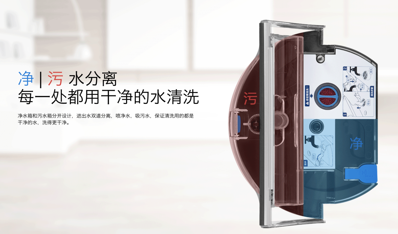 ILIFE智意W400所采用的大容量凈污水箱分離設計,隨時確保只用凈水洗地,極大地提升了清潔效果。