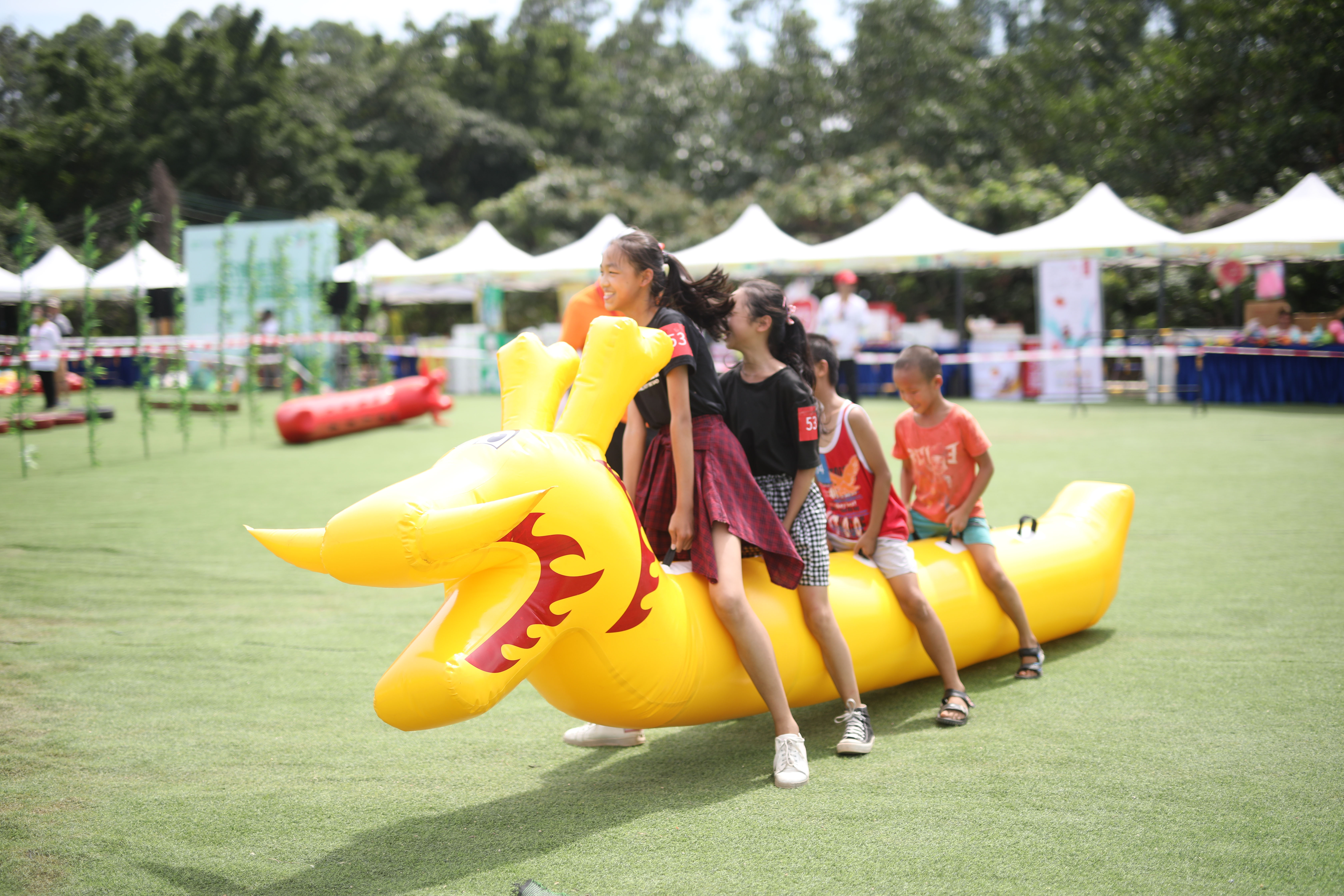 家長小朋友共騎在龍舟上用腳往前沖,有的隊(duì)伍步調(diào)一致,快速地奔向終點(diǎn),贏得觀眾的齊聲喝彩而有的隊(duì)伍則踉踉蹌蹌,引起觀眾陣陣笑聲。
