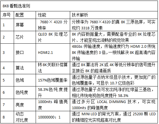 在行業(yè)趨勢及國家政策的雙重推動下,為正確引導(dǎo)8K電視市場發(fā)展方向、加快發(fā)展步伐,TCL聯(lián)合國家廣播電視產(chǎn)品質(zhì)量監(jiān)督檢驗(yàn)中心經(jīng)過長時間的市場調(diào)研及總結(jié),從行業(yè)整體的角度對8K電視進(jìn)行了初步探討,并編制出《8K8看甄選白皮書》。這份白皮書告訴我們,實(shí)現(xiàn)真正的8K震撼視覺體驗(yàn)關(guān)鍵性能/技術(shù)要求如下。