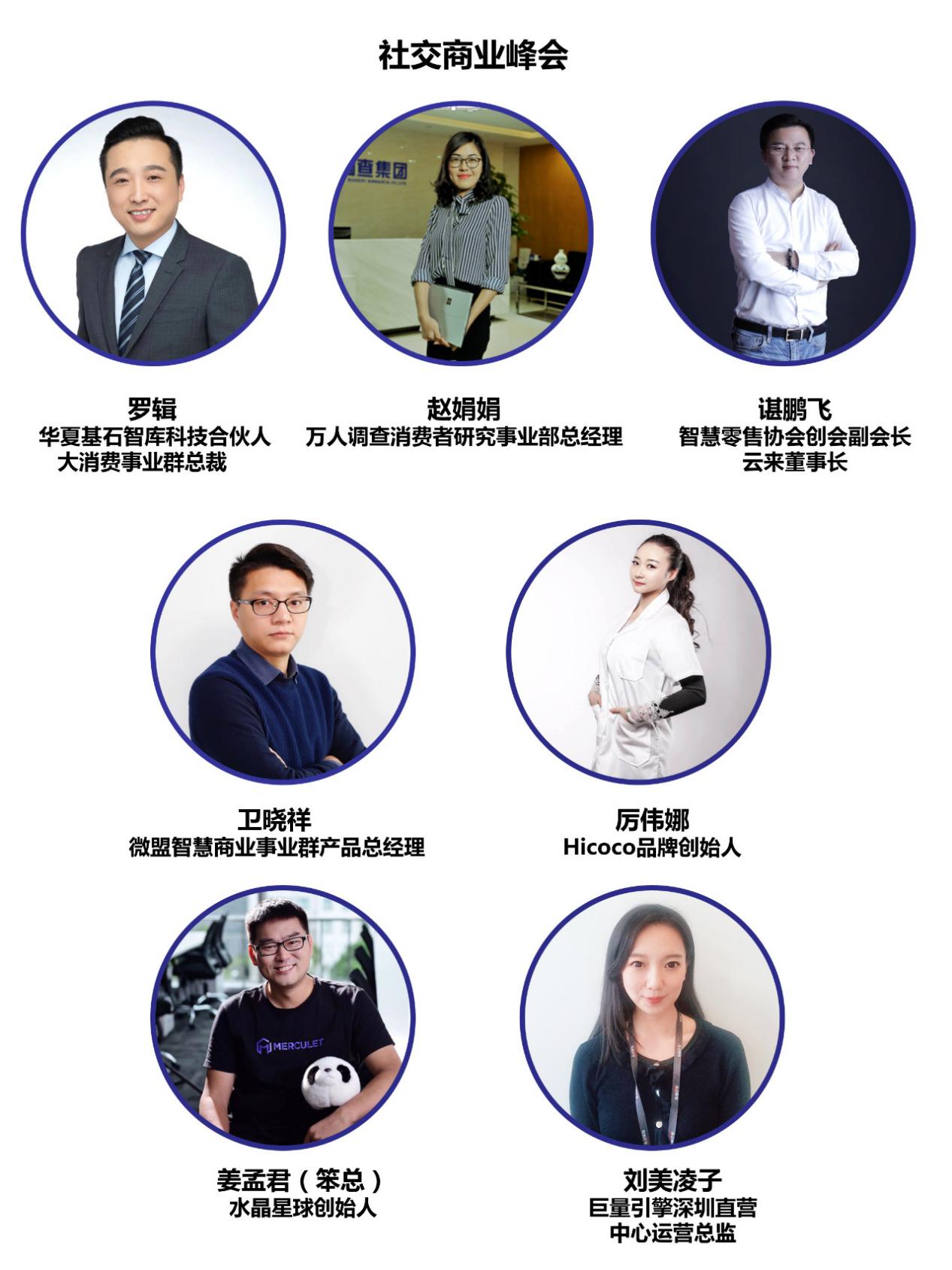10月30日14:00—17:00(宴會(huì)廳Ⅲ)舉行社交電商峰會(huì),華夏基石智庫(kù)科技合伙人、大消費(fèi)事業(yè)群總裁羅 輯主持峰會(huì)。萬(wàn)人調(diào)查消費(fèi)者研究事業(yè)部總經(jīng)理趙娟娟演講主題《2019年深圳市消費(fèi)者線上線下渠道消費(fèi)洞察》,智慧零售協(xié)會(huì)創(chuàng)會(huì)副會(huì)長(zhǎng)、特聘專家;云來(lái)董事長(zhǎng)諶鵬飛演講主題《私域流量社交商業(yè)模式解碼》,微盟智慧商業(yè)事業(yè)群產(chǎn)品總經(jīng)理衛(wèi)曉祥演講主題《企業(yè)布局社交電商的四種模式》,Hicoco品牌創(chuàng)始人厲偉娜演講主題《說(shuō)說(shuō)美業(yè)那些事》,水晶星球創(chuàng)始人姜孟君演講主題《社群時(shí)代的影響力和業(yè)績(jī)?cè)鲩L(zhǎng)》,巨量引擎深圳直營(yíng)中心運(yùn)營(yíng)總監(jiān)劉美凌子演講主題《D造營(yíng)銷新零售助力品牌升級(jí)布局》