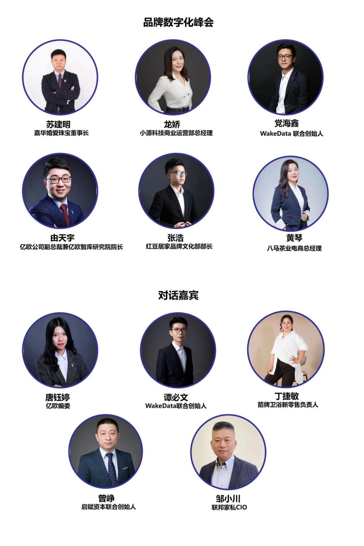 10月30日14:00—17:00(宴會(huì)廳Ⅱ)舉行品牌數(shù)字化峰會(huì),由嘉華婚愛(ài)珠寶董事長(zhǎng)蘇建明主持。小源科技商業(yè)運(yùn)營(yíng)部總經(jīng)理龍嬌演講主題《企業(yè)AI場(chǎng)景化服務(wù)之道》 WakeData聯(lián)合創(chuàng)始人黨海鑫演講主題《喚醒數(shù)據(jù)讓企業(yè)更懂自己的用戶》,億歐公司副總裁兼億歐智庫(kù)研究院院長(zhǎng)由天宇演講主題《品牌的技術(shù)創(chuàng)新與潮流變革》,紅豆居家品牌文化部部長(zhǎng)張浩演講主題《基于用戶的品牌數(shù)字化升級(jí)》,八馬茶業(yè)電商總經(jīng)理黃琴演講主題待定。圓桌對(duì)話由億歐編委唐鈺婷主持,對(duì)話嘉賓包括WakeData聯(lián)合創(chuàng)始人譚必文,啟賦資本聯(lián)合創(chuàng)始人曾 崢,箭牌衛(wèi)浴新零售負(fù)責(zé)人丁捷敏,聯(lián)邦家私CIO鄒小川。