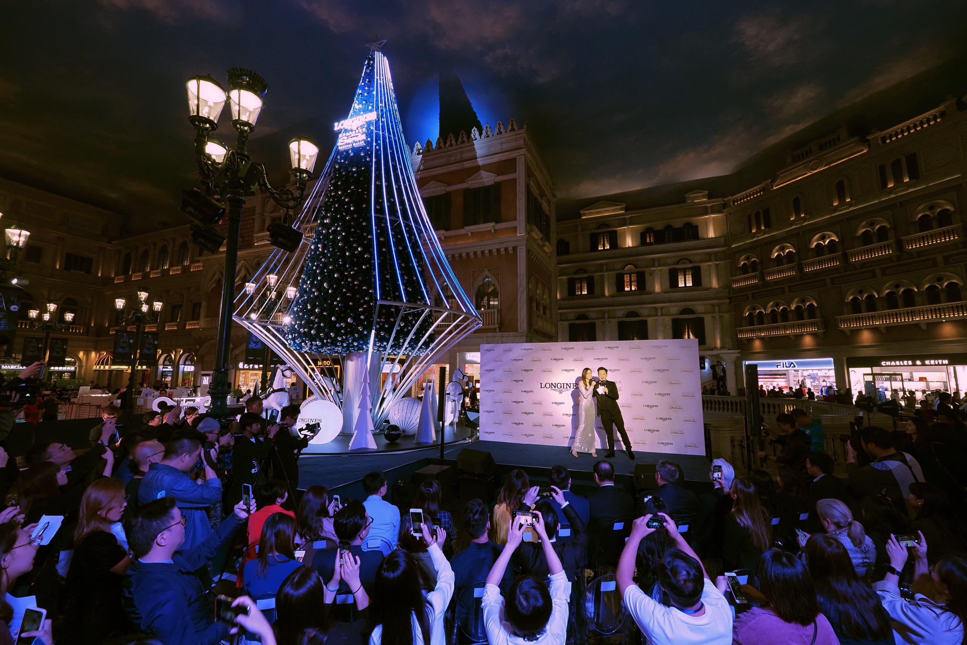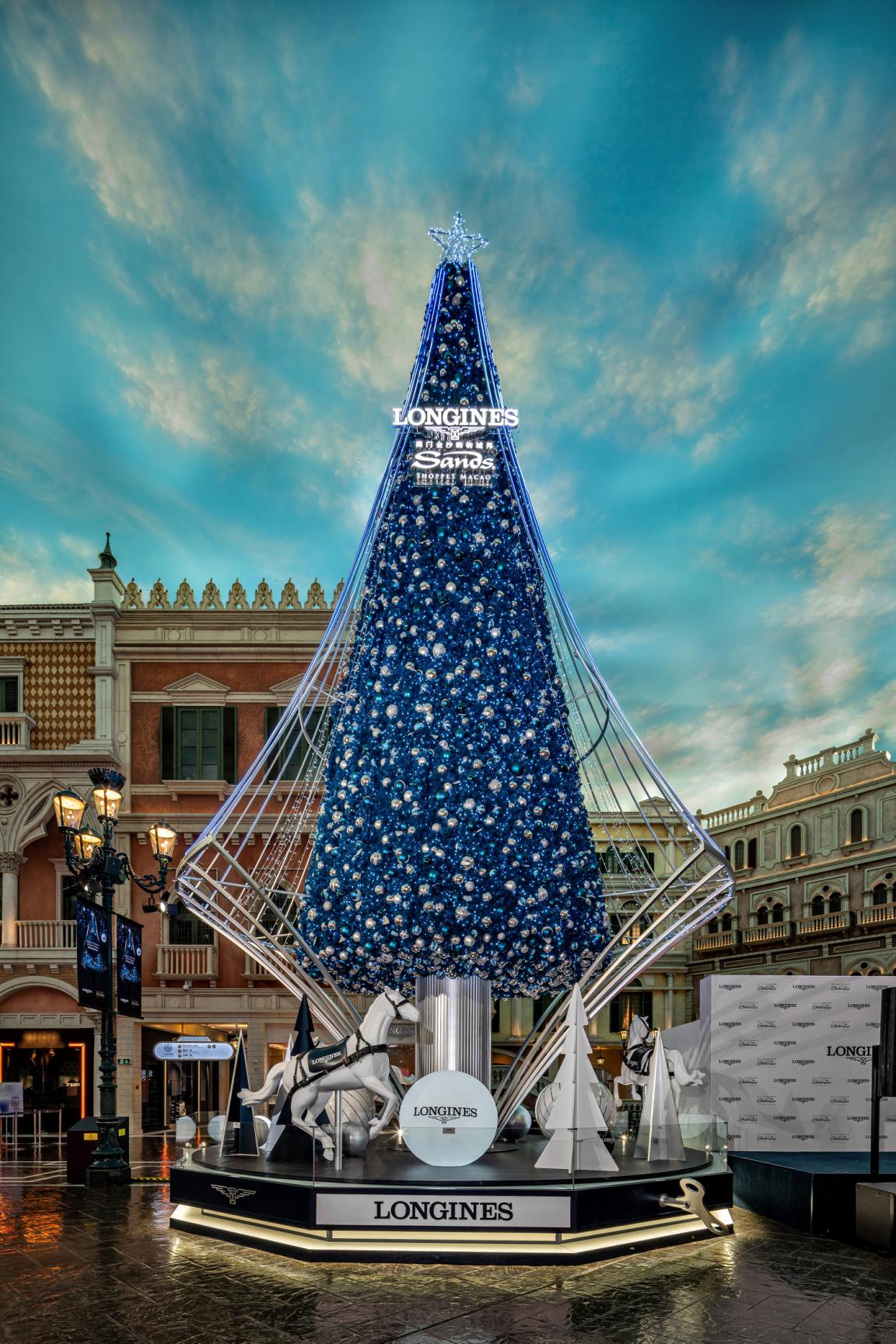 亮燈儀式于威尼斯人購物中心圣馬可廣場舉行,影視明星鐘嘉欣受邀出席,并與浪琴澳門副總裁鄭美齡、金沙中國有限公司零售市場推廣副總裁Rita Simonetta及金沙中國有限公司商場管理部總監(jiān)梁俊強一同啟動高達13米的藍色菱形圣誕樹底部的音樂盒裝置。