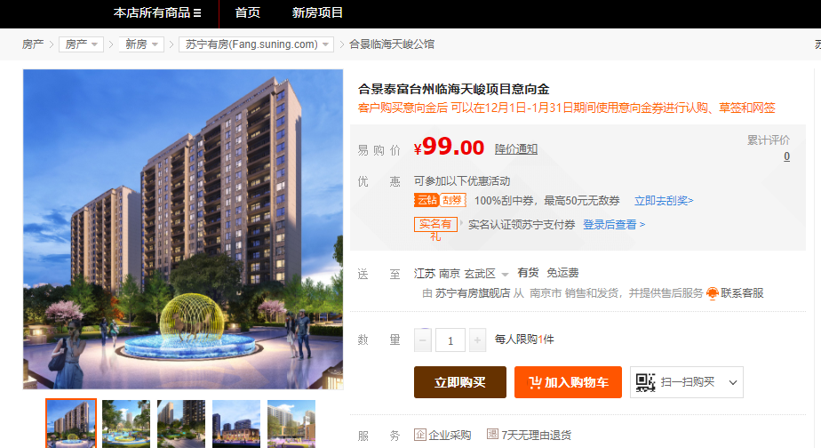 購(gòu)房者在蘇寧易購(gòu)首頁進(jìn)入“新房特惠”專題,選擇意向房源,購(gòu)買99元意向金之后,可優(yōu)先購(gòu)買雙十二特價(jià)房。