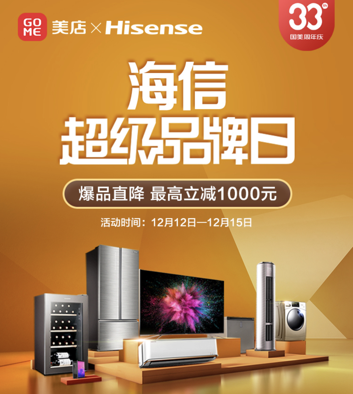 深圳新聞網(wǎng)2019年12月12日訊 12月12日-15日,國(guó)美33周年慶活動(dòng)已經(jīng)啟動(dòng),屆時(shí)消費(fèi)者可在深圳國(guó)美門(mén)店參與“全場(chǎng)好物,第二件5折起”活動(dòng)。同時(shí),海信、海爾、美的超級(jí)品牌日活動(dòng)也將于12日-15日期間在國(guó)美美店展開(kāi)。用戶在國(guó)美APP中美店活動(dòng)專(zhuān)區(qū)便可參與到活動(dòng)中來(lái),下面為大家介紹下本次海信超級(jí)品牌日的重磅爆品,全場(chǎng)最高立減1000元,還有機(jī)會(huì)獲得愛(ài)奇藝四端VIP會(huì)員卡和小度音箱等福利獎(jiǎng)品,不要錯(cuò)過(guò)。