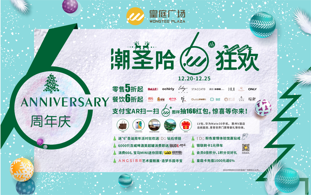 六周年慶期間,深圳皇庭廣場攜手場內(nèi)200余家優(yōu)質(zhì)商戶、銀聯(lián)等進(jìn)行資源合作,并通過自有小程序,組合線上引流包,啟動(dòng)支付寶AR掃碼抽LV、華為手機(jī)、166元現(xiàn)金紅包及商戶百萬代金券驚喜;網(wǎng)紅餐飲、時(shí)尚零售折扣低至冰點(diǎn);更有迷“6”周年派對狂歡送百萬好禮,寶馬MINI送回家等驚喜活動(dòng),期待與你在皇庭的光影空間里拉近距離,一起吃喝玩樂,嗨購潮玩,6周年的故事期待有你參與!