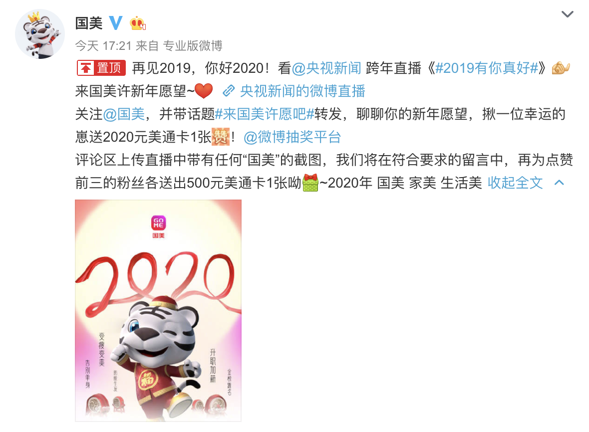 今年是國美首次聯合央視新聞跨年直播,為實現廣大國美用戶的心愿,回饋消費者。國美還在微博啟動多個有獎轉發(fā)活動,獎品為面值200元、500元、2020元的國美美通卡,如果沒有趕上央視新聞的跨年直播,還可在國美官方微博參與抽獎,新的一年有好的開始,沒準下個錦鯉就是你!(常軍平)