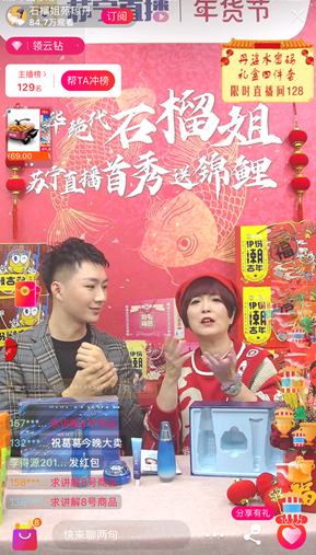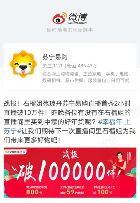 2020年伊始,“風(fēng)華絕代”的石榴姐苑瓊丹在蘇寧易購(gòu)開(kāi)始了新年帶貨直播首秀,為全網(wǎng)用戶(hù)推薦實(shí)用年貨,超過(guò)100萬(wàn)人“圍觀”了直播,兩小時(shí)帶貨超10萬(wàn)件,平均每分鐘售出800件年貨,其中最受消費(fèi)者歡迎的來(lái)伊份潮吉多堅(jiān)果禮盒59秒售罄,創(chuàng)下2020年明星帶貨的新記錄!