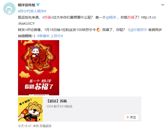 蘇寧代言人楊洋和江疏影也給大家?guī)砹瞬簧俑@?,粉絲們繼續(xù)喊話愛豆,“過年就差一個楊洋了,萬一實現(xiàn)了呢”。蘇寧家電直接開啟鼠運來襲模式,粉絲參與微博互動,就有機會獲得2020元蘇寧紅包,還能獲得楊洋同款SKG按摩儀。