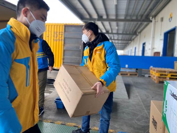 蘇寧華中物流園,蘇寧物流將防疫物資裝車送到醫(yī)務工作者、前線記者、快遞員手中