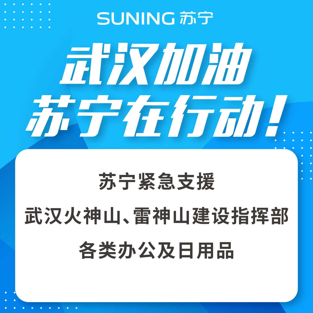 而在疫情防控一線,自春節(jié)期間肺炎疫情發(fā)酵以來,蘇寧迅速行動,在武漢組建了支援團隊及時響應(yīng)一線需求,通過定向向武漢火神山、雷神山醫(yī)院,以及武漢和周邊地區(qū)的醫(yī)療、公安等機構(gòu)進行捐贈,緊急支援消毒水、口罩、防護服、醫(yī)用手套、電器、電腦、日用品等一系列物資,以解疫區(qū)燃眉之急。