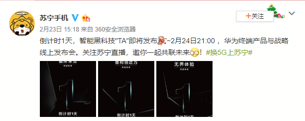 深圳新聞網(wǎng)2020年2月24日訊 2月24日21時,華為新品“云發(fā)布會”將在蘇寧直播舉行,余承東等華為高層將亮相,為大家?guī)矶嗫钚缕?。從蘇寧手機(jī)官方微博發(fā)布內(nèi)容可以看到,此次華為新品發(fā)布會將推出全新的折疊屏手機(jī) Mate Xs以及新一代平板和筆記本電腦。