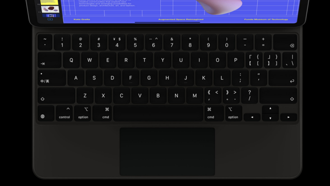 此外,Magic Keyboard自帶的 USB-C接口還能進(jìn)行直通充電。同時,懸浮式支架設(shè)計,可以讓用戶隨意調(diào)節(jié)觀看角度,新版的iPad Pro就像是一塊小尺寸的辦公神器。