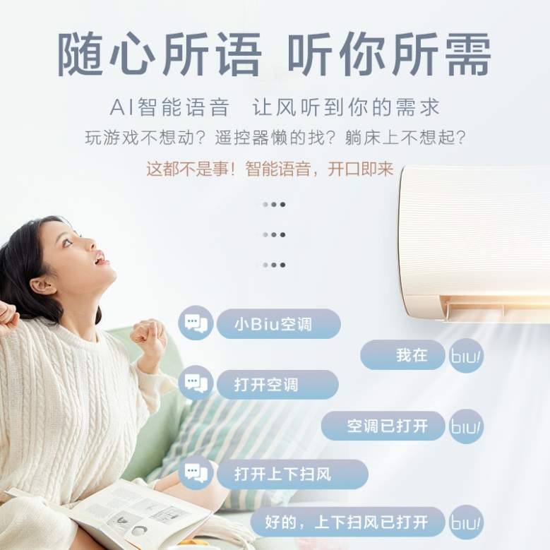 此外,小Biu空調(diào)Max搭載了AI智能語音控制技術(shù),你只需要對它說“小Biu空調(diào)”將其喚醒,就能實現(xiàn)開機(jī)關(guān)機(jī)、模式切換、調(diào)節(jié)溫度等操作,實現(xiàn)了真正的智能語音操控。同時,小Biu空調(diào)Max采用行業(yè)一流的海立壓縮機(jī),并具有高溫自清潔、APP遠(yuǎn)程控制、急速冷暖等亮點功能,提供整機(jī)6年、壓縮機(jī)10年保修的服務(wù)。