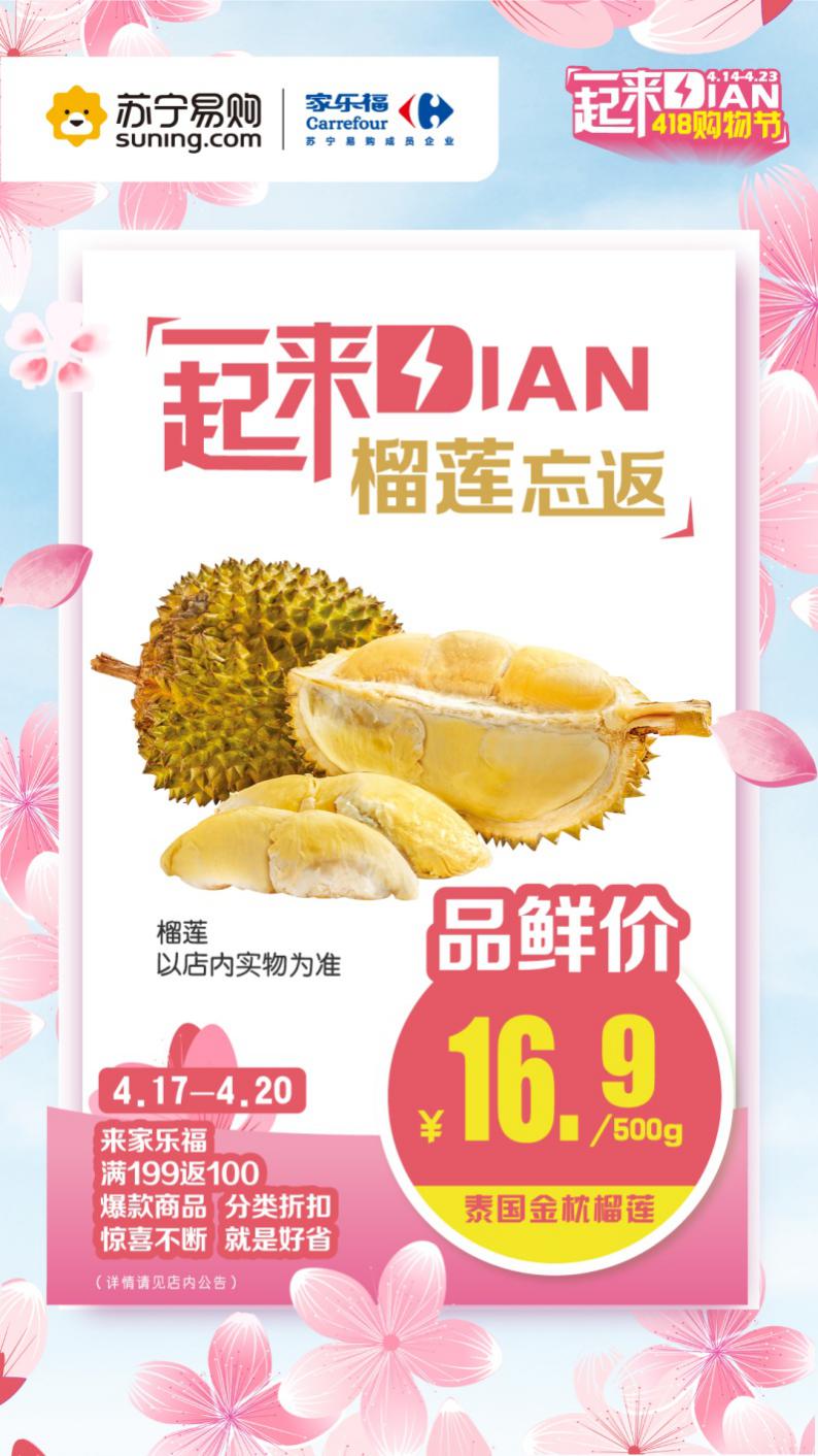 據(jù)有關(guān)方面透露,即將啟幕的“4.18一起來Dian”購物節(jié),家樂福將加碼福利,推出重磅優(yōu)惠的同時,奉上多款強勢優(yōu)質(zhì)生鮮爆品,勢要擊穿底價。以“水果之王”榴蓮為例,每斤16.9元的限時品鮮價。