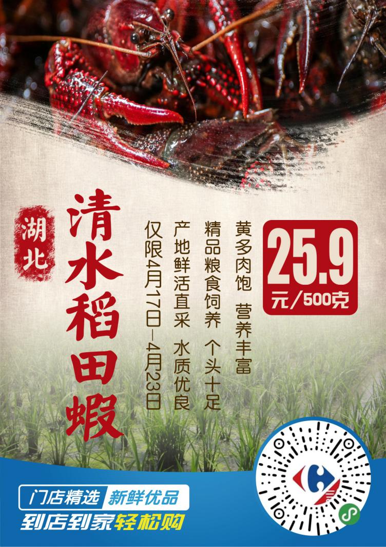 15號(hào)開始捕撈的這批湖北“清水稻田蝦”將于16號(hào)完成分揀裝車,發(fā)往家樂(lè)福全國(guó)各地大倉(cāng),17號(hào),家樂(lè)福位于北京,上海、哈爾濱,長(zhǎng)沙,成都,昆明,廣州,深圳等地的155家門店鮮活開售,恰逢家樂(lè)福418購(gòu)物節(jié),嘗鮮價(jià)低到25.9元/500克(僅限4月17日至23日)。同時(shí),顧客還可以通過(guò)家樂(lè)福小程序、蘇寧易購(gòu)app、蘇寧小店App、及美團(tuán)、餓了么下單,享受1小時(shí)送到家的極致“鮮“體驗(yàn)。