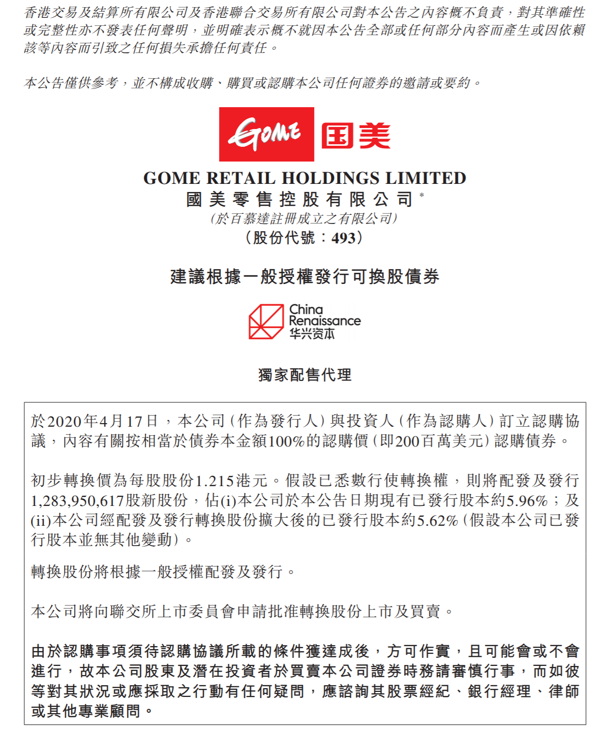 公告稱,拼多多以總計2億美金的可轉(zhuǎn)換債券方式對國美進行戰(zhàn)略投資。根據(jù)協(xié)議,初步股份轉(zhuǎn)換價為每股1.215港元,分別較國美零售2020年4月17日收盤價及截至2020年4月16日前五個連續(xù)交易日之平均收盤價溢價66.44%及68.75%。