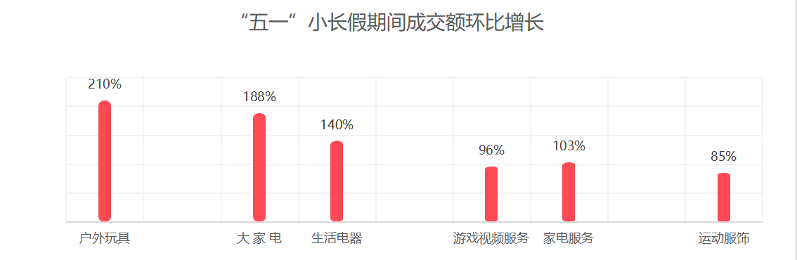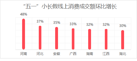 “五一”小長假尤其對河南、河北、安徽等中部省份的線上消費拉動作用更強。由于一線城市的線上消費趨于日?;?,人們多外出活動,用親近大自然、戶外活動的方式度過假日。同時,一部分在大城市里工作的人員也在假日返回老家,帶動了中部省份的線上消費。