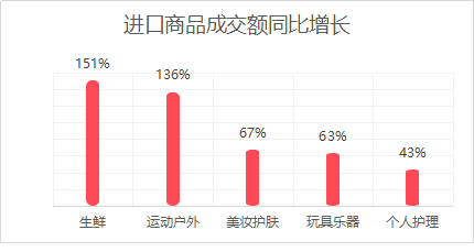 隨著人們生活水平的提升,進口生鮮成交額同比增長了151%。近幾年,進口生鮮的價格門檻下降,尤其是進口的奶制品、豬肉、牛肉的價格跟國產(chǎn)商品十分接近。此外,借助于品牌優(yōu)勢,進口的運動戶外、美妝護膚、玩具樂器、個人護理等商品的成交額同比增長也比較高。