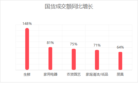 “五一”小長假期間,國產(chǎn)商品的成交額同比增長了52%。國產(chǎn)的生鮮產(chǎn)品十分豐富,農(nóng)產(chǎn)品觸網(wǎng)利用信息經(jīng)濟快速的將地方市場轉化為全國市場,成交額同比增長了148%。此外,國產(chǎn)的家電、農(nóng)資園藝、清潔用品及廚具的成交額同比增長較高。