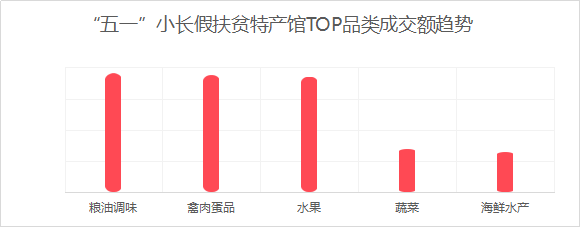 借助“五一”小長假及線上消費增長的勢頭,各地的線上扶貧特產(chǎn)館成交額同比增長了135%。各產(chǎn)地的糧油調味、禽肉蛋品、水果、蔬菜及海鮮水產(chǎn)等特產(chǎn)的成交額最高。