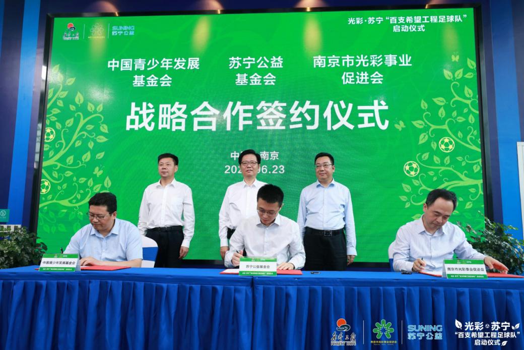 中國青少年發(fā)展基金會黨委常委、副秘書長梅峰,南京市工商聯(lián)副主席、市光彩事業(yè)促進會副會長錢衛(wèi)冰,南京市委統(tǒng)戰(zhàn)部一級調(diào)研員、市光彩事業(yè)促進會副會長張福東,江蘇省企業(yè)團工委書記、省青年商會秘書長薛保剛,南京市委統(tǒng)戰(zhàn)部經(jīng)濟處處長、市光彩事業(yè)促進會秘書長端澤明,蘇寧控股集團黨委書記、江蘇蘇寧足球俱樂部董事長王哲,蘇寧控股集團黨委常務副書記、蘇寧公益基金會理事長馬康等領(lǐng)導出席參與了啟動儀式。與此同時,江蘇蘇寧足球俱樂部的吳曦、吉翔、馬君等球星,以及受助學校師生代表,也在現(xiàn)場一同見證了公益計劃的啟動。