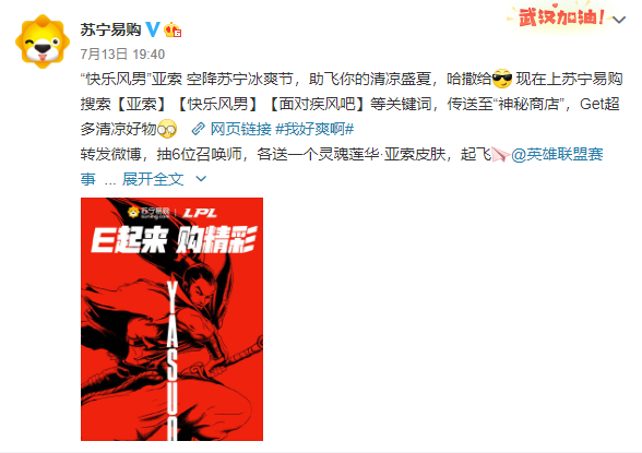 見圳客戶端·深圳新聞網(wǎng)2020年7月14日訊 昨日,蘇寧易購官方微博發(fā)布消息稱,LPL代言人亞索亮相蘇寧冰爽節(jié),將和蘇寧“E起”為廣大用戶及粉絲創(chuàng)造快樂。打開蘇寧并搜索“亞索”、“快樂風(fēng)男”或“面對疾風(fēng)吧”,均可進(jìn)入冰爽節(jié)亞索主題會場,領(lǐng)取召喚師福利。