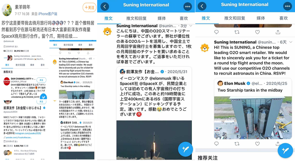 一個馬斯克,一個前澤友作,這趟萬眾矚目的繞月之旅原本跟我們國內是沒什么關系的,但因為蘇寧的出現(xiàn)突然有了轉機。有微博用戶爆料,蘇寧7月中時候就在推特向馬斯克及前澤友作分別拋出合作求繞月旅行船票的橄欖枝。